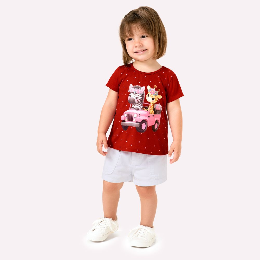 O grande destaque fica por conta da estampa localizada com glitter, que traz uma dupla irresistível, com a zebra e uma girafa, passeando em um charmoso carrinho rosa. Com riqueza de cores, expressão amigável e detalhes cintilantes, a estampa transforma a peça em uma verdadeira história em movimento, despertando a criatividade infantil.
