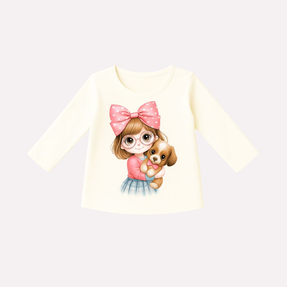O destaque fica por conta da estampa localizada que traz uma delicada ilustração de menina com cachorrinho, criando uma cena doce e cheia de personalidade. O detalhe do laço aplicado complementa o visual com um toque especial, acrescentando charme e sofisticação à composição. Versátil e encantadora, esta blusa infantil menina é perfeita para compor looks confortáveis e cheios de estilo, refletindo a delicadeza e a qualidade da marca Kyly.