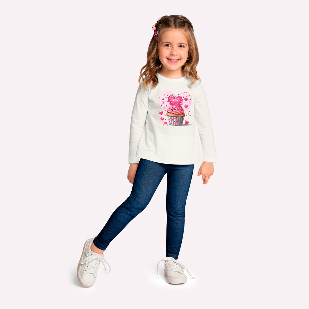 O destaque fica por conta da estampa localizada de cupcake, que traz uma ilustração delicada e divertida, cercada por corações que reforçam o visual romântico da peça. A aplicação de strass acrescenta brilho sutil e sofisticado, valorizando ainda mais a estampa e criando um efeito encantador que chama a atenção de forma delicada. Perfeita para compor looks confortáveis e cheios de personalidade, esta blusa infantil menina une suavidade, estilo e a qualidade reconhecida da marca Kyly.