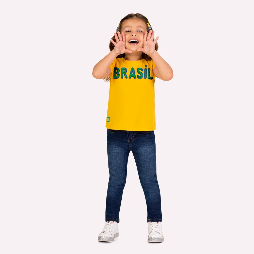 O grande destaque fica por conta do bordado lettering “Brasil” aplicado na parte frontal, que adiciona textura, sofisticação e um acabamento delicado à peça. Na barra, o detalhe termocolante com a bandeira do Brasil complementa o visual com um toque temático sutil e encantador, reforçando o clima de Copa do Mundo. Na vibrante cor amarelo, símbolo da torcida brasileira, essa blusa infantil menina é perfeita para compor looks temáticos para assistir aos jogos, eventos esportivos, festas escolares ou momentos de lazer em família durante a temporada da Copa do Mundo.