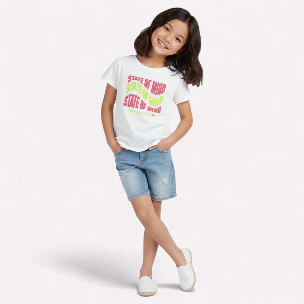 O diferencial está na estampa localizada com lettering “STATE OF MIND”, em cores vibrantes que deixam a peça descolada. O acabamento da barra e das mangas em duas agulhas garante resistência, tornando-a ideal para acompanhar todas as aventuras da infância.