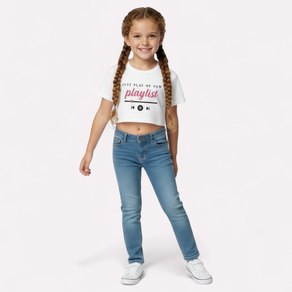 O destaque fica para a estampa localizada “Just play my new playlist”, perfeita para meninas que amam música e querem looks divertidos. Um básico atualizado que combina com várias produções.