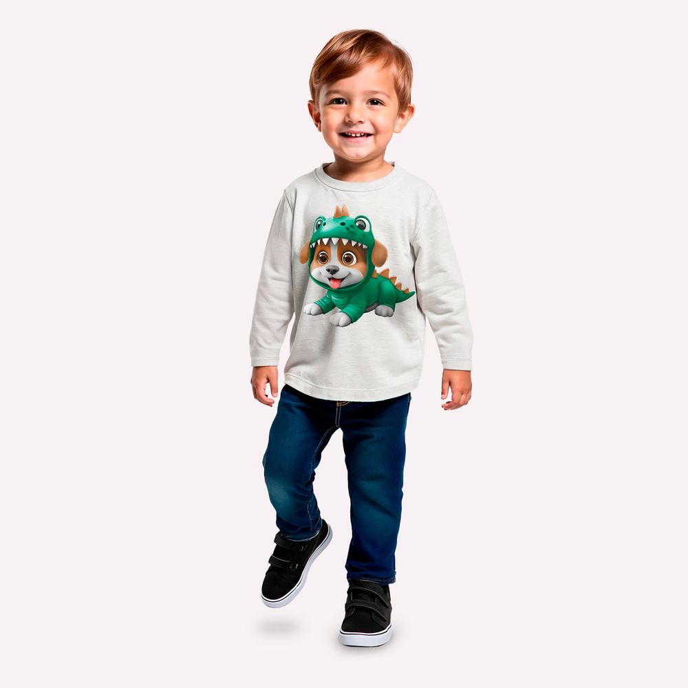 O destaque da peça está na estampa localizada de cachorrinho vestido de dinossauro, que cria uma composição divertida e expressiva. O design colorido e detalhado adiciona um ar moderno e descontraído à camiseta, tornando-a ainda mais especial para os pequenos que adoram personagens e elementos do universo animal. A gola com acabamento em ribana reforça a estrutura da peça e contribui para um ajuste confortável. Versátil e cheia de estilo, esta camiseta infantil da Kyly é ideal para compor looks casuais em dias de clima ameno ou quente, combinando facilmente com bermudas, calças ou conjuntos confortáveis para o dia a dia.