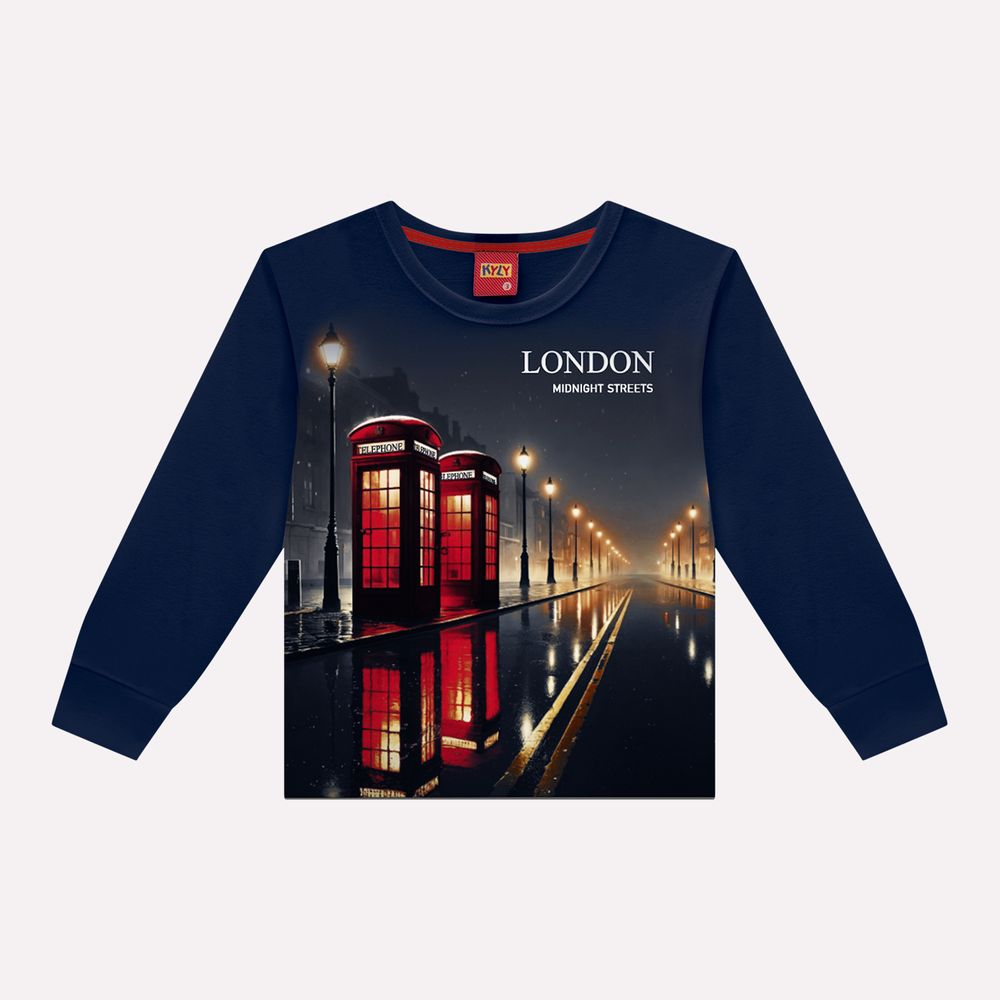 O destaque da peça está na estampa localizada com paisagem urbana noturna inspirada nas ruas de Londres. A composição apresenta as icônicas cabines telefônicas vermelhas em contraste com a iluminação da cidade refletida na estrada, criando um visual marcante e sofisticado. O detalhe em lettering “London – Midnight Streets” complementa o design com um toque moderno e cosmopolita, valorizando ainda mais a proposta da peça. Versátil e estilosa, esta camiseta infantil da Kyly é perfeita para compor looks casuais com calças ou bermudas, ideal para acompanhar os meninos em passeios, momentos de lazer e descobertas do dia a dia.