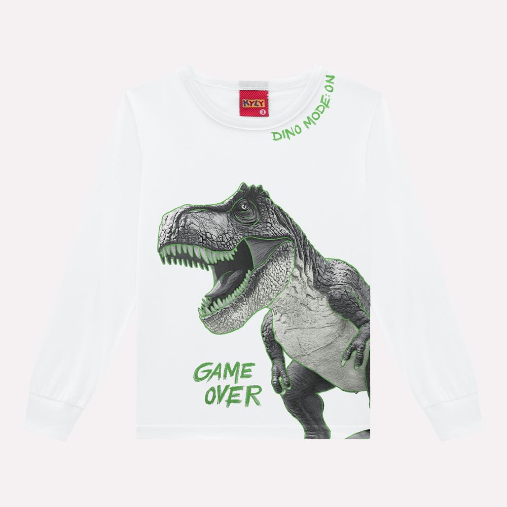 O grande destaque da peça é a estampa localizada de dinossauro, com ilustração expressiva que traz um visual impactante e cheio de personalidade. O design é complementado por detalhes em lettering, como “Game Over” e “Dino Mode On”, que adicionam um toque moderno e divertido à composição. A combinação de elementos cria uma estética dinâmica e cheia de energia, ideal para meninos que gostam de looks com atitude. Versátil e estilosa, esta camiseta infantil da Kyly é perfeita para compor produções casuais e confortáveis, combinando facilmente com bermudas, calças ou conjuntos para acompanhar os pequenos em todas as aventuras.