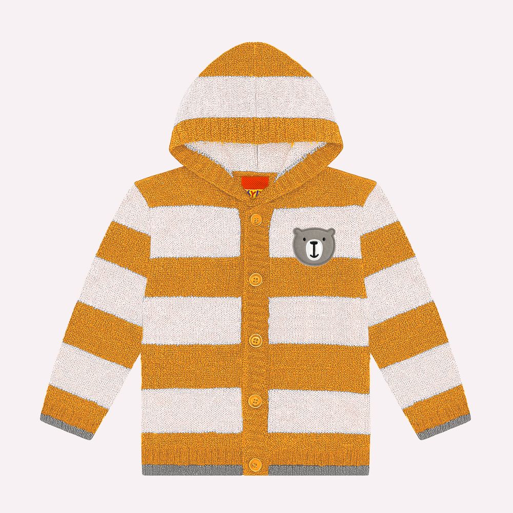 O design refinado da peça se destaca pelo tricot listrado, um clássico atemporal que adiciona charme ao visual infantil. O capuz funcional proporciona um toque extra de proteção contra o frio, enquanto o fechamento por botões confere praticidade na hora de vestir.