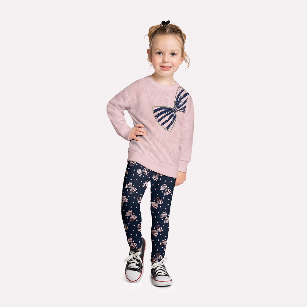Complementando o look, a legging em molicotton felpado, composta por 96% algodão e 4% elastano, se ajusta ao corpo com conforto e flexibilidade, permitindo total liberdade para brincar e se movimentar. A estampa rotativa de lacinhos adiciona um toque romântico e delicado à peça, enquanto o elástico na cintura garante um ajuste prático e confortável.