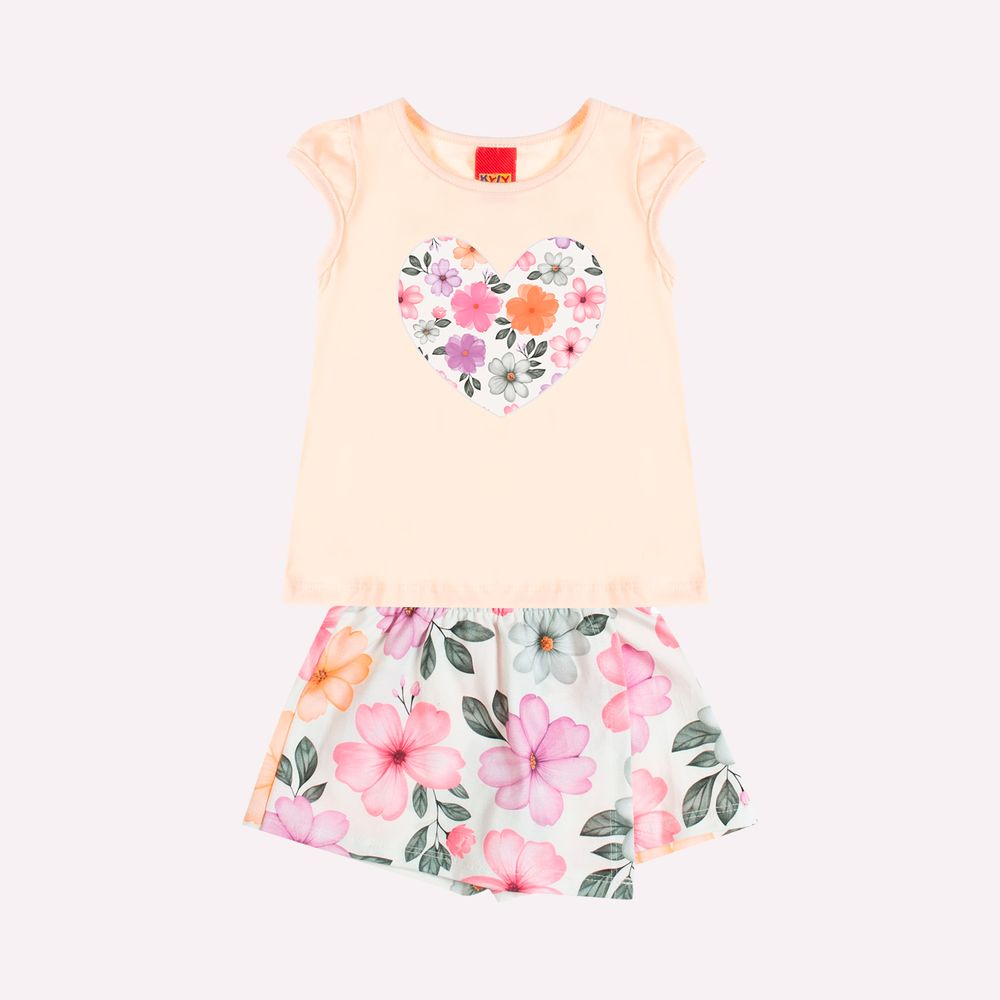 Com uma proposta romântica e leve, o conjunto infantil menina Kyly é ideal para acompanhar as pequenas com charme e liberdade em todas as ocasiões. A blusa é confeccionada em meia malha 100% algodão, oferecendo toque macio e respirabilidade ideal para os dias mais quentes. Seu grande destaque é o bordado localizado em formato de coração com flores, que adiciona delicadeza ao visual com um toque artesanal.