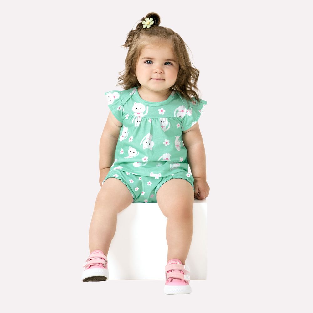 A blusa com estampa rotativa de gatinhos e florzinhas transmite ternura e alegria, com visual lúdico e acolhedor. Os babadinhos nas mangas e no peitilho, junto ao franzido frontal, adicionam volume delicado e movimento à peça, valorizando o caimento leve e soltinho, ideal para o conforto e bem-estar da bebê ao longo do dia.