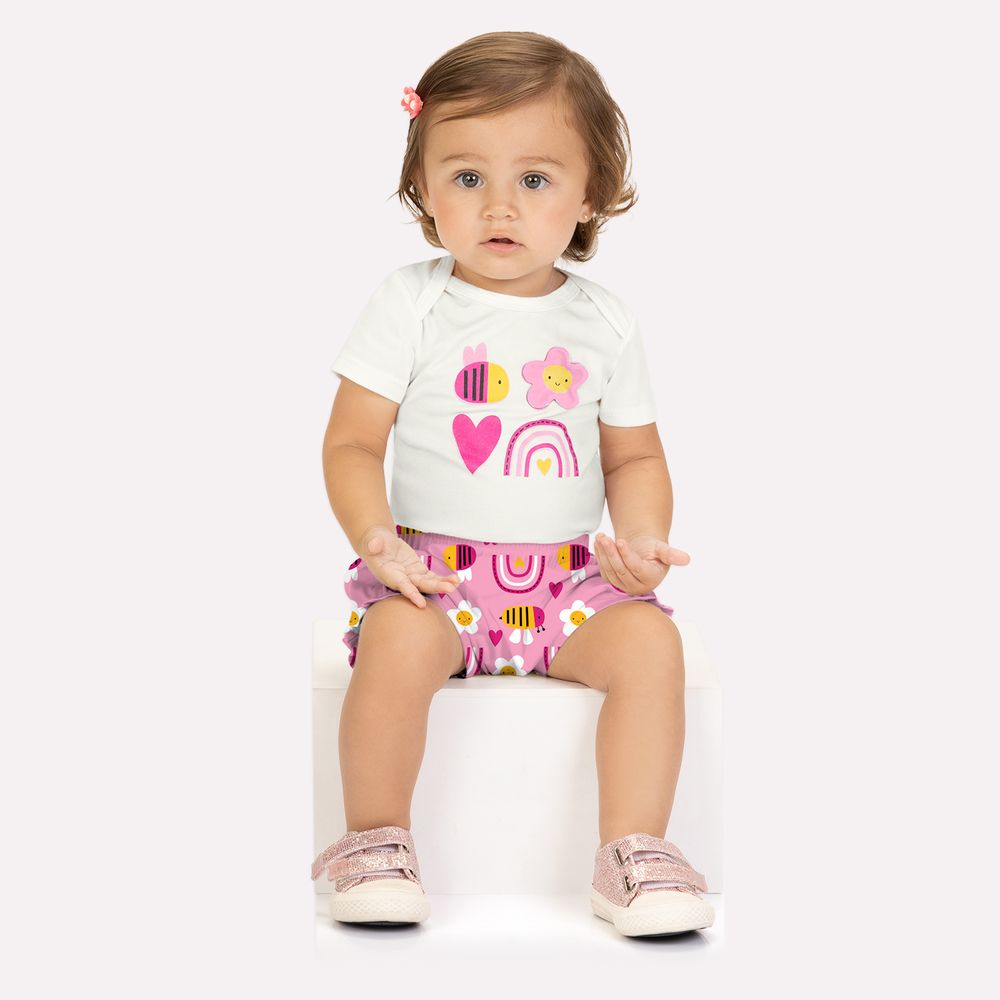 Um look doce e encantador para as pequenas! O conjunto bebê menina Kyly traz conforto, praticidade e muito charme em cada detalhe. Composto por body em cotton, 95% algodão e 5% elastano. Possui modelagem confortável, com mangas curtas e decote americano que facilita na hora de vestir. E entrepernas com botões de pressão, tornando as trocas rápidas e práticas. A estampa delicada com abelhinha, flor, coração e arco-íris deixa o visual alegre e cheio de ternura.