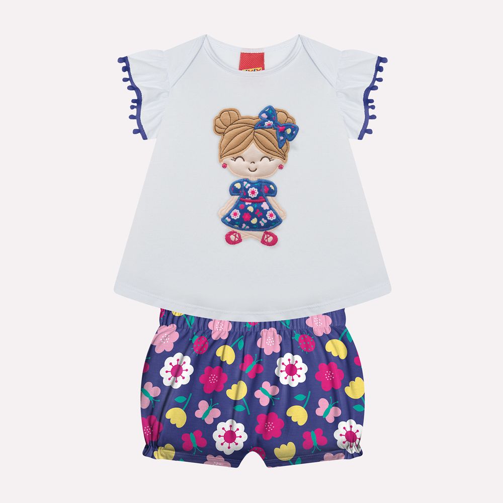 O short em meia malha 100% algodão, estampado vem repleto de flores e borboletas coloridas, criando um contraste alegre e vibrante com a blusa. O cós elástico oferece ajuste confortável, ideal para os momentos de brincar, engatinhar e explorar o mundo com alegria. Um conjunto leve, fofo e cheio de amor, perfeito para deixar cada momento ainda mais especial!