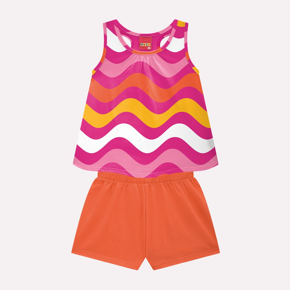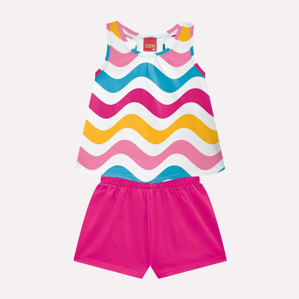 Cheio de cores, alegria e movimento! O conjunto infantil menina Kyly ondas traz toda a energia divertida do mar para o dia a dia das pequenas.