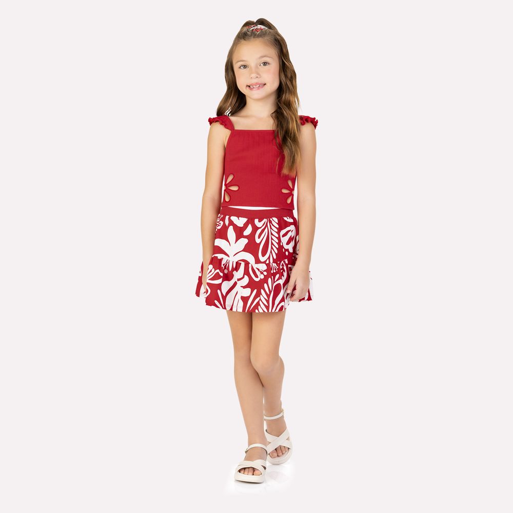 A saia em meia malha 100% algodão, com forro leve da mesma composição, completa o look com conforto e movimento. Sua estampa de folhagens e flores em tons de vermelho e branco cria um visual vibrante e cheio de personalidade, perfeito para dias alegres e ocasiões especiais — inclusive combinações encantadoras para o Natal. O babado na barra traz fluidez e um ar gracioso a cada passo. Um conjunto que une estilo, conforto e um toque tropical — ideal para brilhar em qualquer momento do dia!