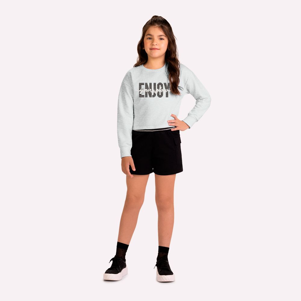 O casaco cropped é confeccionado em moletinho sem felpa 100% algodão, proporcionando toque macio, leveza e excelente respirabilidade. A modelagem mais curta confere um visual moderno e despojado, enquanto o caimento confortável garante liberdade de movimentos para acompanhar todas as brincadeiras. O destaque da peça está na estampa localizada em lettering “Enjoy”, que acrescenta um toque urbano e atual ao visual. A gola, os punhos e a barra em acabamento canelado ajudam a estruturar a peça e oferecem melhor ajuste ao corpo, valorizando a modelagem.