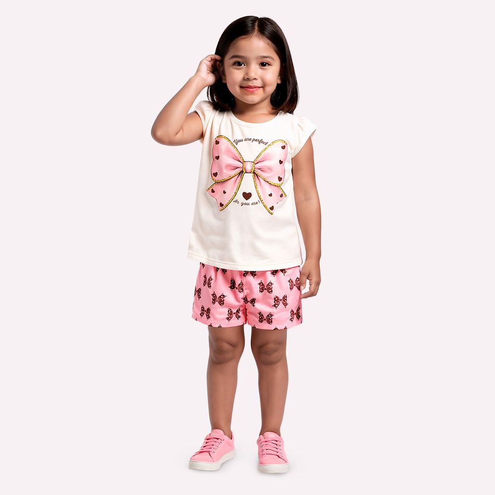 O short, produzido em cotton com 95% algodão e 5% elastano, apresenta modelagem confortável, com elasticidade na medida certa para acompanhar os movimentos da criança. O cós elástico garante ajuste seguro e prático, enquanto a estampa rotativa de laços complementa o conjunto com equilíbrio e suavidade, criando uma composição visual leve e harmoniosa. Cada detalhe foi pensado para unir funcionalidade e delicadeza, resultando em um conjunto confortável, versátil e cheio de charme. Uma escolha perfeita para looks fresquinhos, que finalizam o visual com um toque doce e especial.