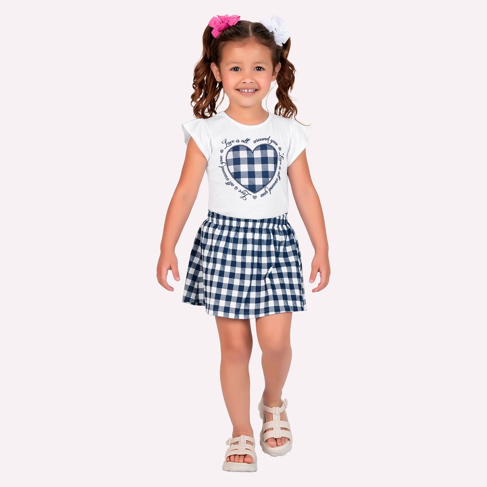 A parte superior é confeccionada em meia malha 100% algodão, com toque macio e respirável. Sua modelagem confortável apresenta caimento leve ao corpo, enquanto as mangas com babadinhos acrescentam delicadeza e movimento à peça. A estampa localizada de coração em xadrez, acompanhada de lettering, traz um visual afetivo e tradicional, remetendo ao clima alegre das festas juninas com sofisticação.