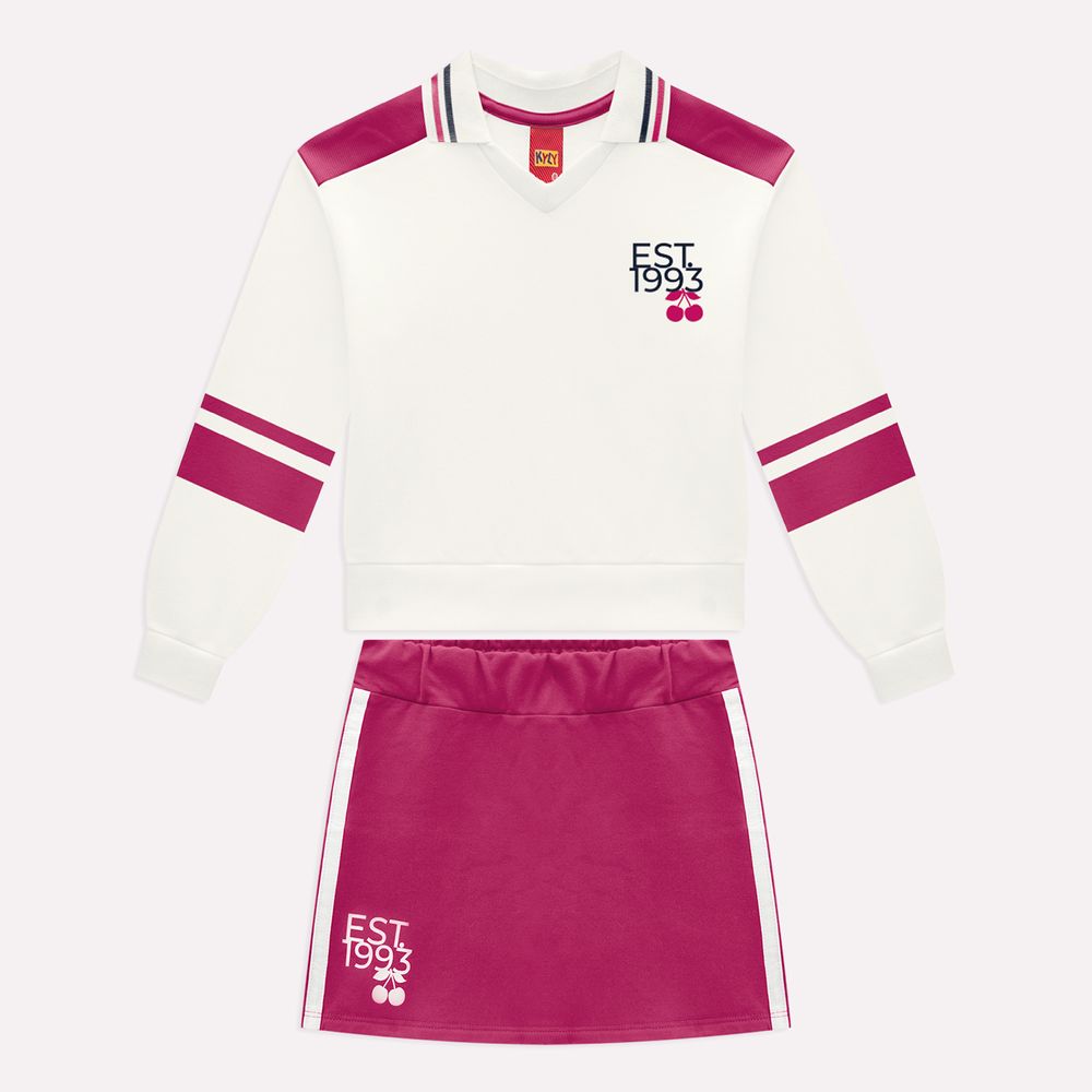 A saia complementa o conjunto com um visual moderno e dinâmico. Confeccionada em moletom de algodão, possui modelagem que proporciona caimento confortável e liberdade para brincar. O cós com elástico oferece ajuste prático e seguro ao vestir, enquanto as faixas laterais contrastantes alongam visualmente a peça. O detalhe de lettering aplicado na barra acrescenta identidade e charme ao look. Perfeito para compor produções casuais em meia-estação ou dias amenos, este conjunto infantil Kyly combina conforto, estilo esportivo e praticidade, ideal para acompanhar a energia e a diversão da infância.
