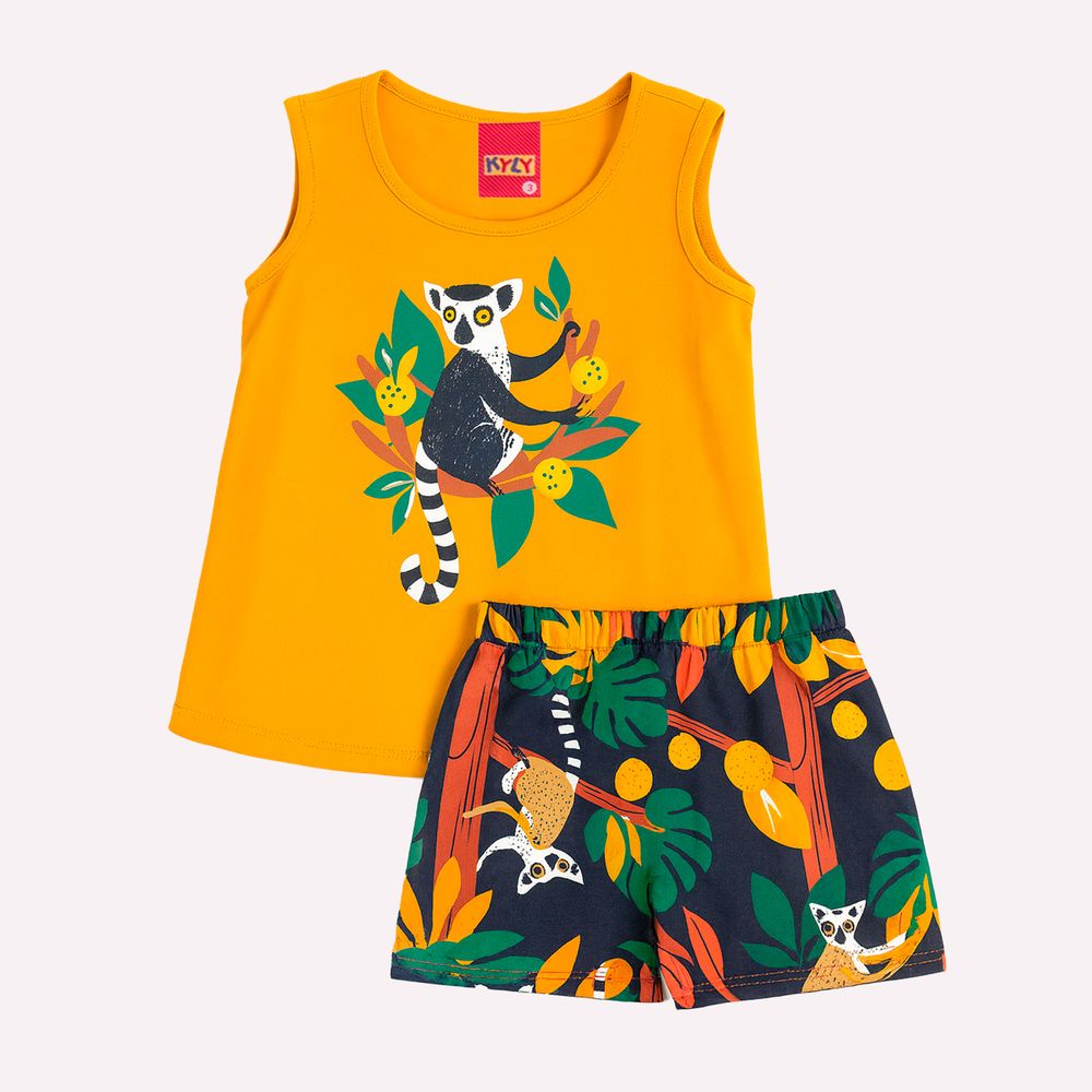 Natureza e diversão em um só look! O conjunto infantil menina Kyly conta com blusa em cotton composto por 95% algodão e 5% elastano, exibindo estampa charmosa de lêmure entre folhagens tropicais. A peça é leve, fresca e cheia de personalidade e conta com decote em U e mangas estilo regata finalizadas em debrum.