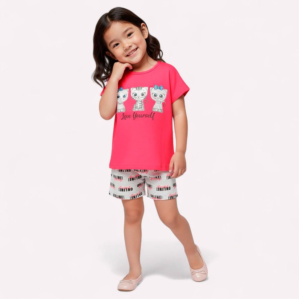 O conjunto infantil menina Kyly traz blusa infantil em cotton 95% algodão e 5% elastano com lettering divertido e estampa de gatinhas cheias de personalidade. O toque macio do tecido aliado à modelagem moderna com decote redondo e mangas curtas para os dias de calor.