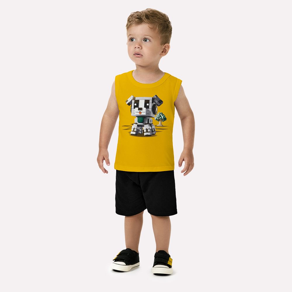 A bermuda em moletom leve complementa o conjunto com praticidade. Sua modelagem solta, com cós elástico, oferece conforto e segurança ao vestir, ideal para acompanhar o ritmo acelerado das brincadeiras. Os tons são coordenados de forma harmônica com a estampa da regata, criando composições alegres e equilibradas. Esse conjunto é perfeito para passeios, férias, tardes no parque ou qualquer momento em que o bem-estar venha acompanhado de estilo.