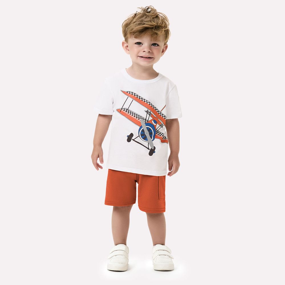A modelagem da camiseta é reta, com mangas curtas e gola redonda. Já a bermuda apresenta cós elástico para ajuste perfeito e bolso lateral funcional, trazendo praticidade para o dia a dia. O grande destaque está na estampa localizada, com um vibrante avião biplano em tons marcantes, transmitindo energia, velocidade e espírito aventureiro. Ideal para passeios, momentos de lazer ou aventuras imaginárias, este conjunto é a escolha perfeita para meninos que adoram brincar e explorar com muito estilo.