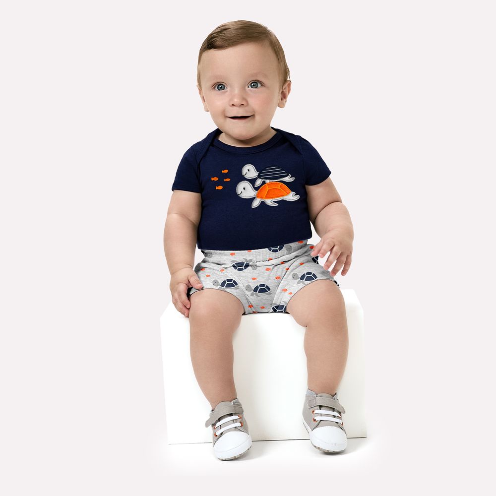 Perfeito para vestir os primeiros momentos com estilo e delicadeza, o conjunto bebê menino Kyly traz uma combinação encantadora entre funcionalidade e um visual lúdico. O body é confeccionado em cotton 95% algodão e 5% elastano, proporcionando um toque macio, flexível e seguro para a pele sensível do bebê. Sua modelagem anatômica com ombros transpassados e abertura inferior com botões de pressão facilita na hora de vestir e trocar. O destaque fica por conta do bordado de tartarugas em contraste com peixinhos, que confere charme e um toque artesanal à peça.