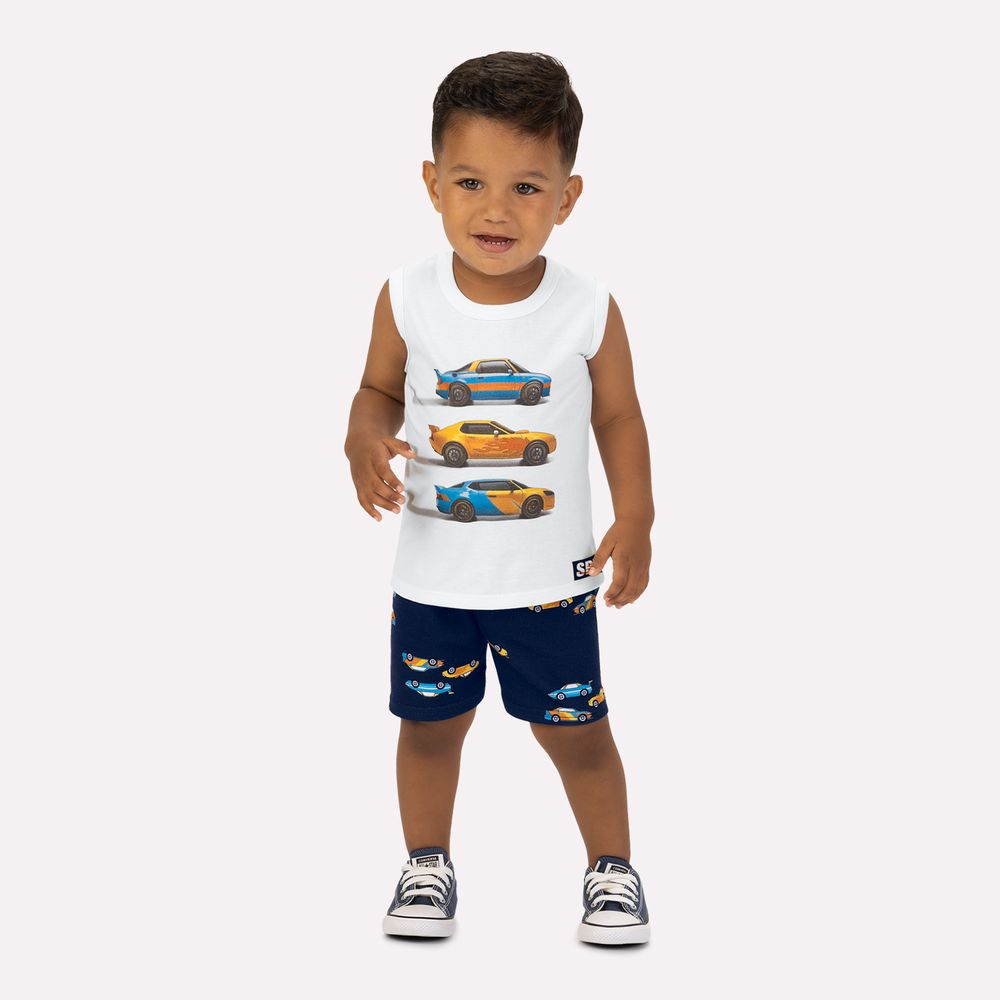 A regata em meia malha traz modelagem soltinha e confortável, com decote redondo e cavas amplas, garantindo frescor nos dias mais quentes. A estampa frontal de carros esportivos com efeito de movimento deixa o visual moderno e cheio de energia. Já a bermuda em moletom sem felpa conta com cós elástico confortável e estampa rotativa de carrinhos, completando o look com um toque divertido e estiloso. Um conjunto que combina conforto e atitude, ideal para meninos cheios de imaginação e espírito aventureiro!