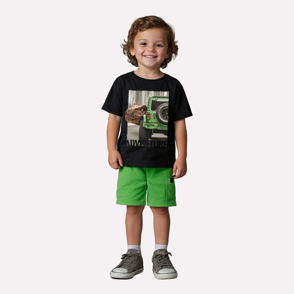 A bermuda em moletom sem felpa 100% algodão completa o look com cós elástico e bolso lateral utilitário, ideal para garantir praticidade e um toque descolado. Um conjunto cheio de personalidade, que une conforto e diversão para acompanhar os meninos em cada descoberta!