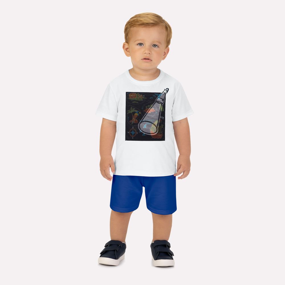A camiseta em meia malha 100% algodão é leve, macia e confortável. O grande destaque está na estampa interativa com tema marítimo, que apresenta um mapa e as estampas se revelam com a latentrna interativa, ilhas misteriosas e tesouros escondidos. As cores vibrantes e os detalhes criativos despertam a curiosidade e o espírito aventureiro das crianças, transformando o look em uma verdadeira viagem ao mundo da imaginação!