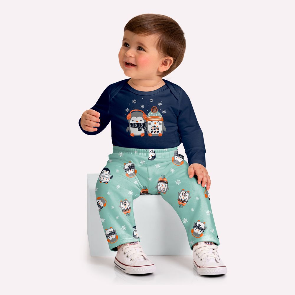 A calça é confeccionada em moletom peluciado 100% algodão, garantindo toque macio e aconchegante para os dias mais frios. A modelagem possui caimento confortável, ideal para acompanhar os movimentos naturais do bebê. O cós com elástico proporciona ajuste seguro e facilita o vestir. A estampa rotativa de pinguins distribuída por toda a peça adiciona um toque lúdico e harmoniza perfeitamente com o body, criando um conjunto alegre e cheio de personalidade. Delicado e confortável, este conjunto bebê menino é perfeito para compor looks casuais em dias mais amenos, ideal para passeios, momentos em família ou para manter o bebê aquecido com estilo.