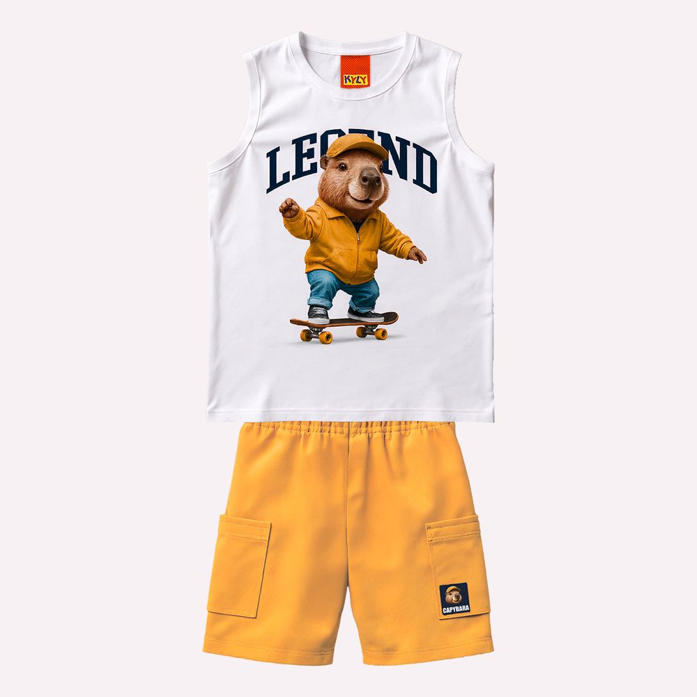 O conjunto infantil menino Kyly é ideal para acompanhar os pequenos em momentos cheios de movimento, conforto e estilo. A regata é confeccionada em meia malha 100% algodão, proporcionando toque macio, leveza e excelente respirabilidade. Sua modelagem confortável apresenta cavas bem definidas e caimento soltinho, garantindo liberdade total de movimentos. A estampa de capivara com lettering e tema skate traz um visual moderno e lúdico, aplicada de forma equilibrada, valorizando a peça com personalidade sem perder a delicadeza infantil.