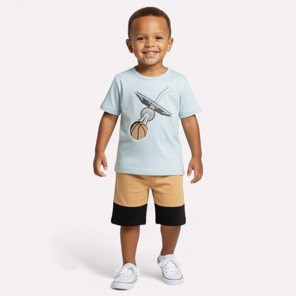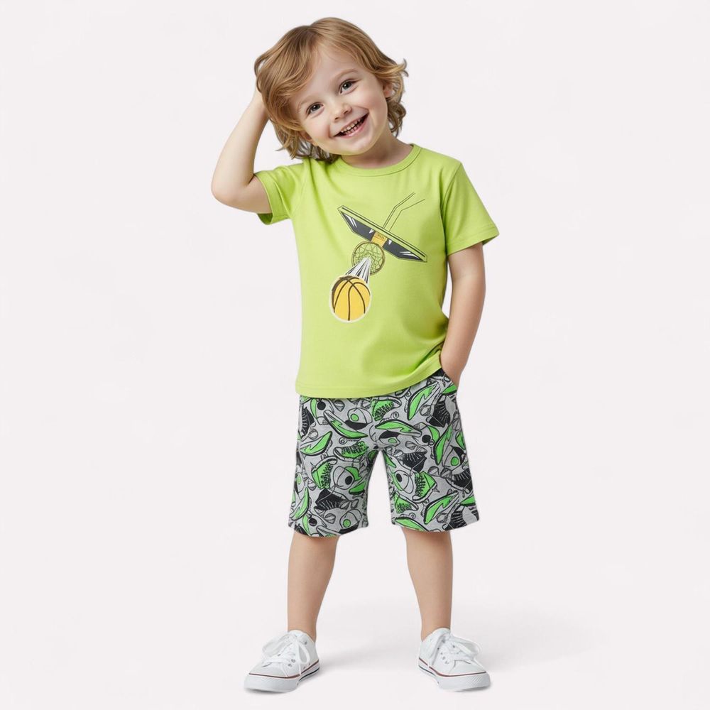 O conjunto infantil menino Kyly conta com camiseta confeccionada em meia malha 100% algodão leve, perfeita para o dia a dia. O destaque fica por conta da estampa localizada com bola de basquete e cesta, que transmite energia esportiva e deixa o look moderno e divertido.