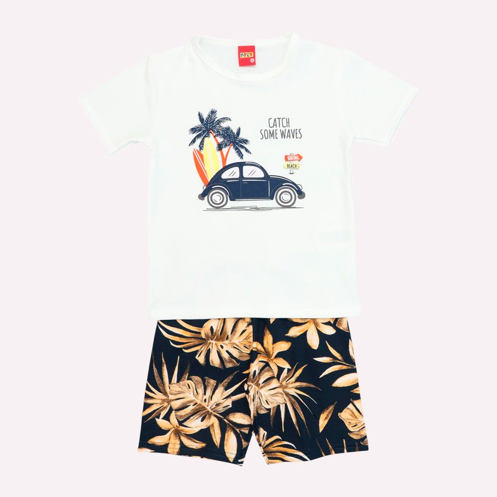 A camiseta em meia malha 100% algodão é leve, fresquinha e super confortável. Sua estampa divertida com fusca, prancha de surfe, coqueiros e lettering transmite toda a vibe praiana e descontraída.
