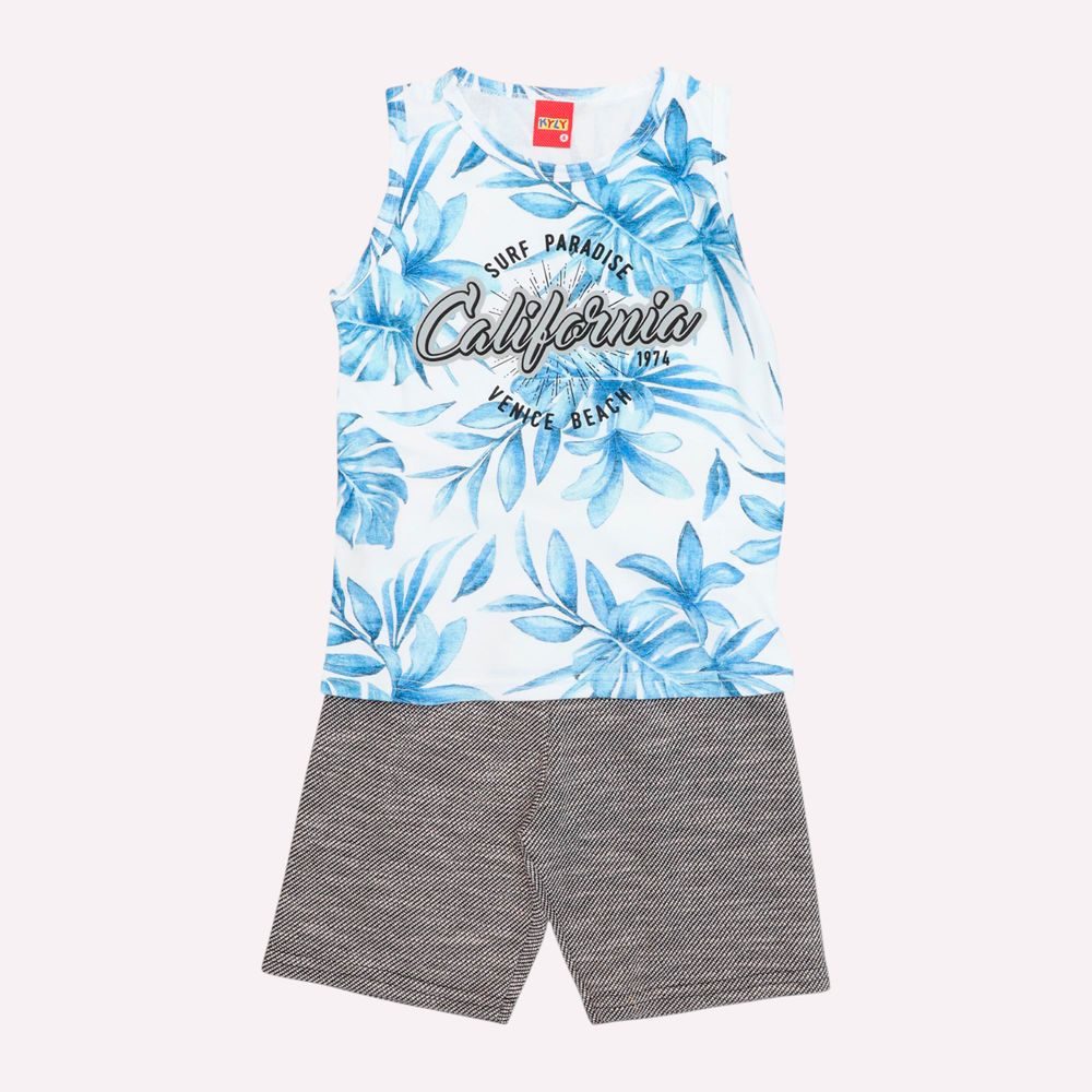 A regata em meia malha 100% algodão estampada combina cores alegres e modernas com lettering criativo e estampas tropicais, incluindo folhas e listras, que remetem ao clima praiano e divertido da estação.