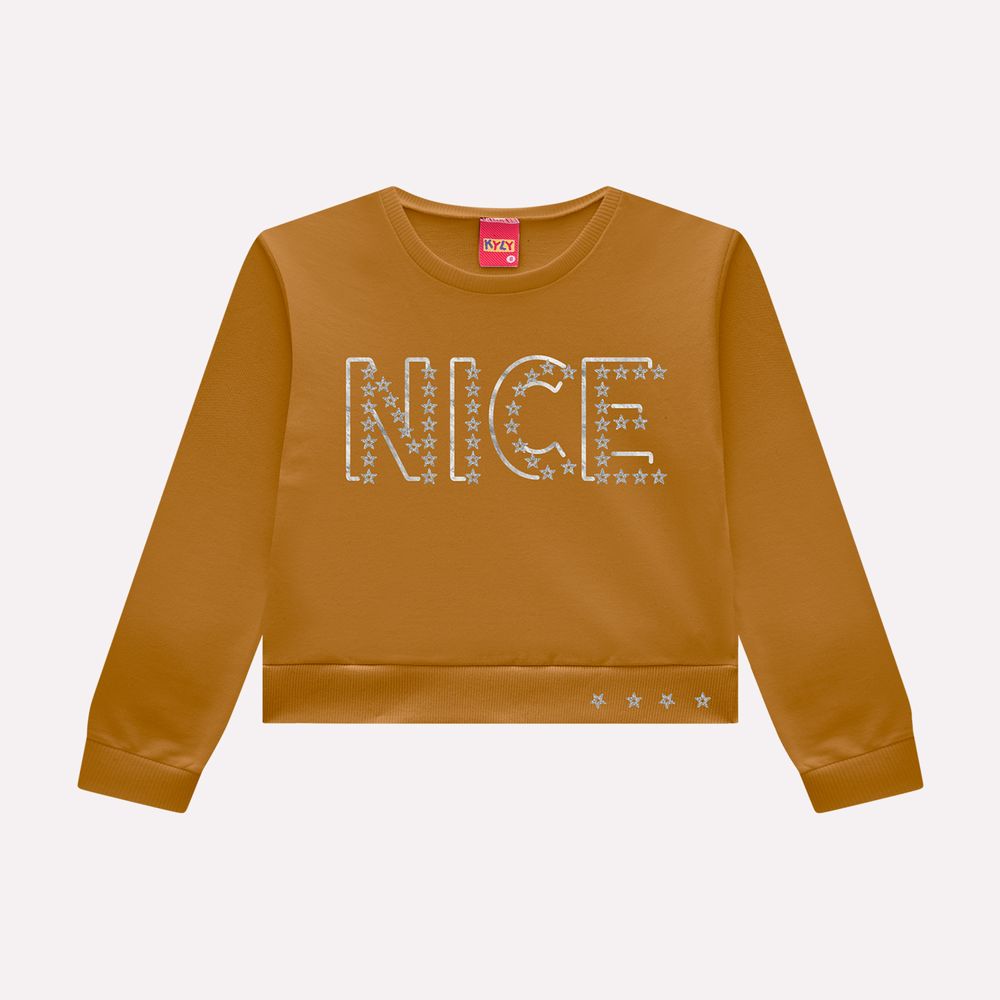 O destaque da peça está na estampa localizada com lettering “Nice”, formada por pequenas estrelas que criam um visual delicado e cheio de charme. O detalhe de estampa também aparece próximo à barra, reforçando a proposta lúdica e trazendo equilíbrio ao design. Os acabamentos em ribana na gola, punhos e barra contribuem para um ajuste confortável e estruturado, elevando a qualidade e o estilo característicos da Kyly. Versátil e estilosa, esta blusa infantil é perfeita para compor produções casuais com calças, leggings ou saias, criando combinações modernas para dias de meia-estação.