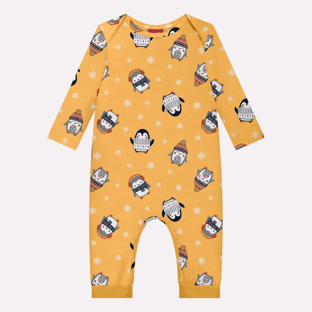 A estampa rotativa de pinguins e flocos de neve cria um visual divertido e delicado, trazendo um charme especial à peça. Como destaque, o bordado aplicado na parte frontal acrescenta textura e um acabamento sofisticado, valorizando ainda mais o design do macacão. O fechamento prático facilita as trocas no dia a dia, garantindo funcionalidade sem abrir mão do conforto. Um macacão bebê menino perfeito para os primeiros meses, combinando aconchego, suavidade e a qualidade reconhecida da marca Kyly.