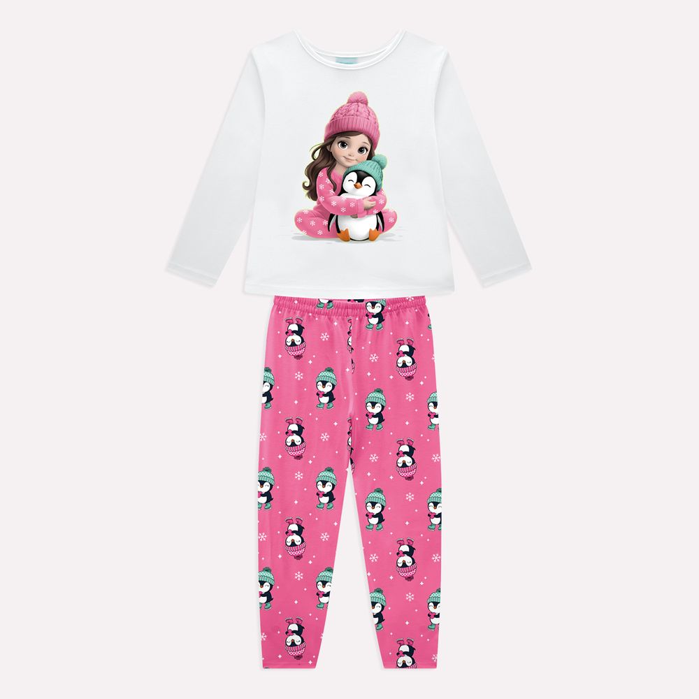 A calça, também em meia malha 100% algodão, complementa o conjunto com modelagem reta e confortável, pensada para acompanhar os movimentos com leveza. A padronagem com pinguins e flocos de neve distribui charme por toda a peça, criando uma composição harmoniosa e divertida. O elástico na cintura proporciona encaixe firme e confortável, sem apertar, valorizando o bem-estar durante o sono. Ideal para noites mais fresquinhas, este pijama infantil de inverno é perfeito para meninas que amam bichinhos e detalhes interativos. Uma escolha que combina qualidade, conforto térmico e um toque mágico que ilumina os sonhos.