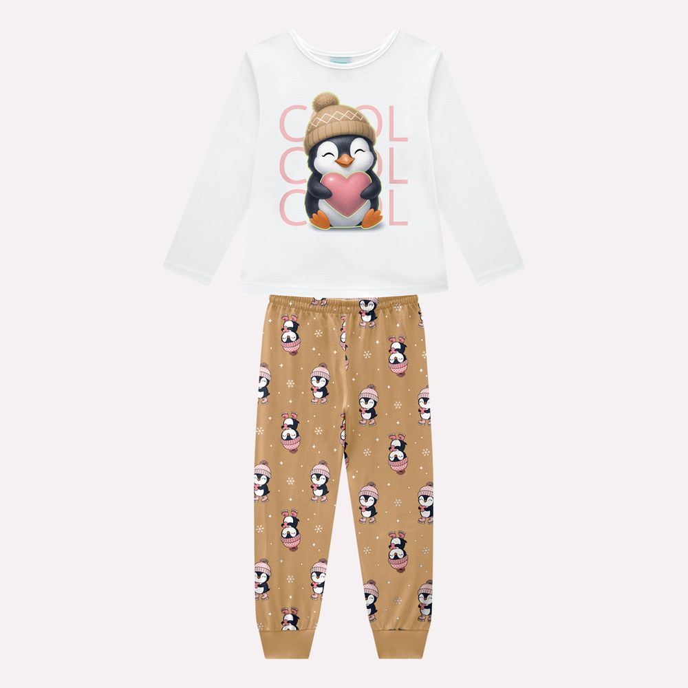A calça, também em meia malha 100% algodão, apresenta modelagem reta com ótimo encaixe ao corpo, proporcionando liberdade e bem-estar durante o sono. A padronagem com pinguins e flocos de neve distribui charme por toda a peça, enquanto o elástico na cintura assegura ajuste confortável e firme, sem marcar. Os punhos na barra contribuem para melhor acomodação nas pernas, mantendo a peça no lugar com delicadeza. Ideal para noites fresquinhas, este pijama infantil de bichinhos é perfeito para meninas que adoram detalhes interativos e estampas delicadas. Uma escolha que une qualidade, conforto e um brilho especial que transforma o momento de dormir em pura magia.