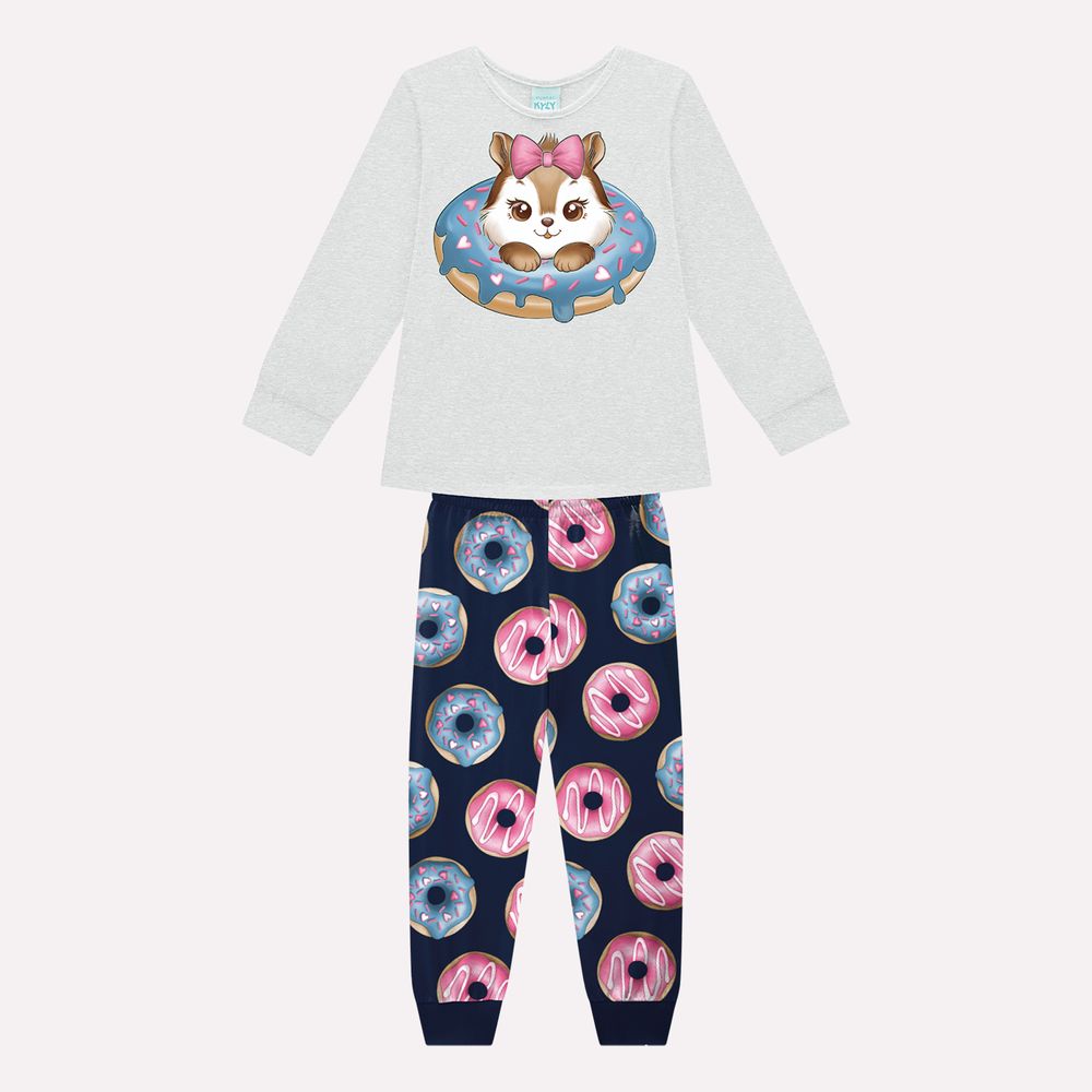 O pijama infantil menina Kyly combina conforto, estampa encantadora e efeito brilha no escuro, criando uma proposta lúdica e cheia de personalidade para as noites de inverno e meia-estação. A blusa é confeccionada em meia malha com 98% algodão e 2% poliéster, oferecendo toque macio, leve elasticidade e excelente respirabilidade. A modelagem apresenta caimento levemente evasê, proporcionando conforto e liberdade de movimentos com delicadeza. O destaque frontal traz um esquilo com laço envolvido por donut com cobertura colorida, formando uma composição divertida e rica em detalhes. A estampa conta com efeito que brilha no escuro, tornando a experiência ainda mais mágica ao apagar das luzes. As mangas com punhos ajustados garantem melhor encaixe e acabamento refinado.