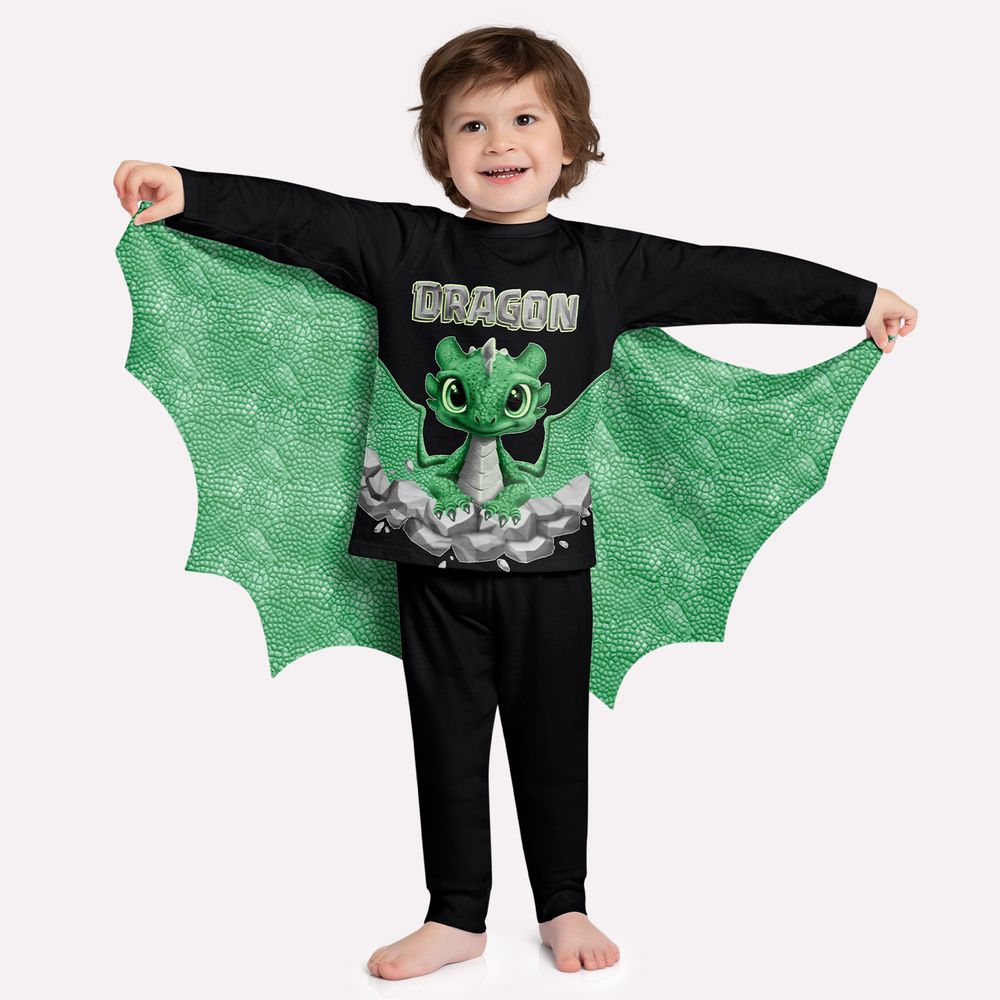A calça básica 100% algodão garante liberdade para se movimentar, mas o grande destaque desse pijama é a capa com asas de dragão 95% poliéster e 5% elastano, que adiciona um toque de fantasia e faz a imaginação voar alto! Perfeito para os pequenos aventureiros que querem dormir como verdadeiros guardiões do reino!