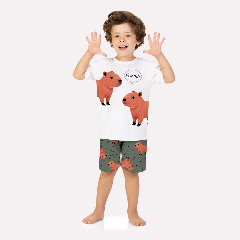 A bermuda completa o conjunto com uma estampa rotativa de capivaras, além de cintura com elástico macio para garantir ajuste e liberdade de movimento. Cheio de personalidade e conforto, esse pijama Kyly é perfeito para os pequenos que adoram bichinhos e muita diversão!