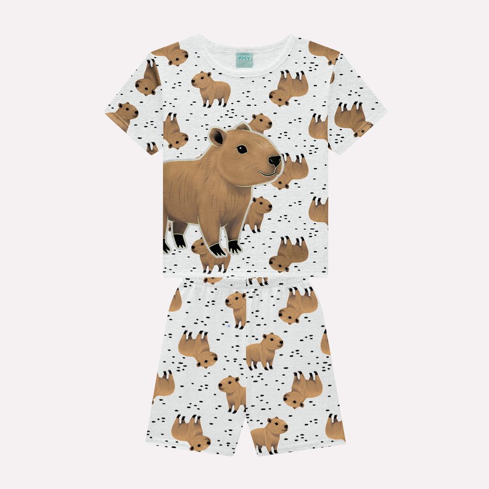 A bermuda acompanha o visual com estampa rotativa de capivaras, combinando perfeitamente com a parte de cima. Sua cintura com elástico macio garante ajuste confortável e liberdade de movimento durante o sono. Um conjunto encantador, divertido e cheio de estilo, ideal para os meninos que amam animais e adoram dormir com conforto e alegria!