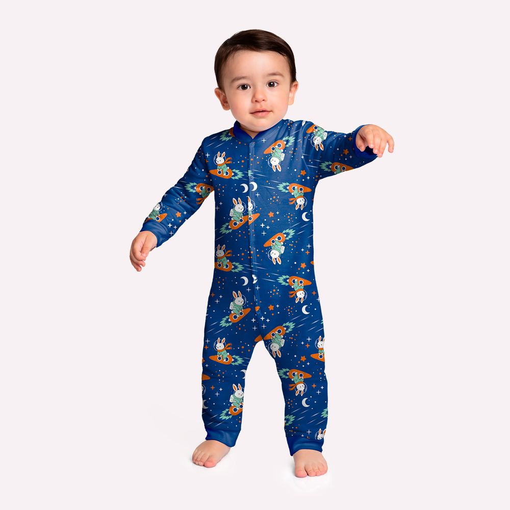 O design apresenta estampa rotativa de coelhinhos astronautas explorando o espaço, acompanhados por foguetes, estrelas e luas que criam uma composição divertida e cheia de aventura. O fechamento frontal com botões traz praticidade ao vestir e facilita o dia a dia, além de acrescentar um detalhe funcional ao visual da peça. Os acabamentos ajustados nos punhos e na barra ajudam a manter o conforto e o caimento adequado. Perfeito para noites aconchegantes e momentos de descanso, este pijama infantil da Kyly combina suavidade, conforto térmico e uma estampa divertida que estimula a imaginação das crianças.