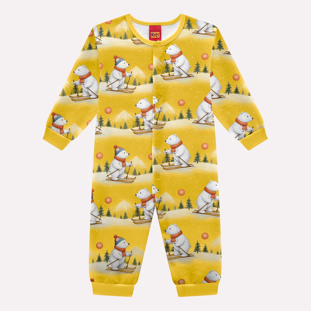 O design apresenta estampa rotativa de ursinhos em cenário de neve, criando uma composição divertida e delicada com elementos como montanhas, árvores e pequenos sóis no horizonte. O fechamento frontal com botões facilita o vestir e traz praticidade para a rotina. Os acabamentos ajustados nos punhos e barras contribuem para um caimento confortável e ajudam a manter o corpo aquecido durante a noite. Perfeito para noites frias e momentos de descanso cheios de aconchego, este pijama infantil da Kyly combina suavidade, conforto térmico e um visual encantador que acompanha os pequenos em sonhos tranquilos.