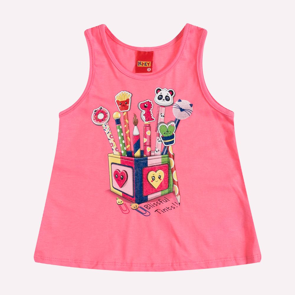 O destaque da peça é a estampa localizada com temática escolar, apresentando uma divertida composição de lápis decorados com personagens e elementos coloridos, como panda, coração e bichinhos fofos, tudo dentro de um porta-lápis que transmite alegria e espontaneidade. Ideal para combinar com shorts, saias ou leggings, essa regata é a escolha perfeita para deixar o visual das meninas ainda mais encantador e cheio de atitude.