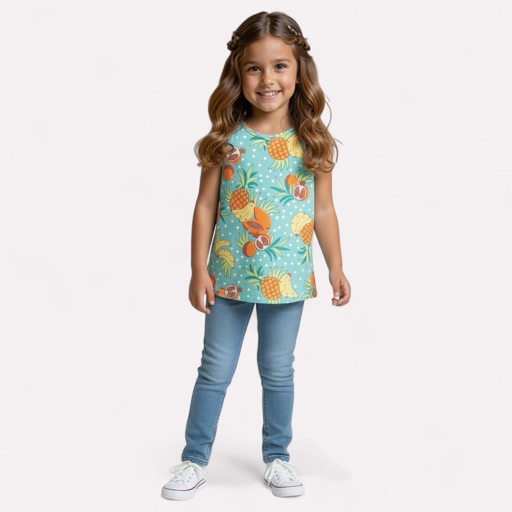 A regata infantil menina Kyly é confeccionada em meia malha 100% algodão, garantindo suavidade e frescor para o dia a dia. Sua modelagem com alças finas e caimento confortável, permite liberdade nos movimentos, com estampa rotativa de frutas tropicais cria um visual alegre e cheio de cor. Versátil e confortável, é perfeita para compor looks leves e estilosos em qualquer ocasião de verão.