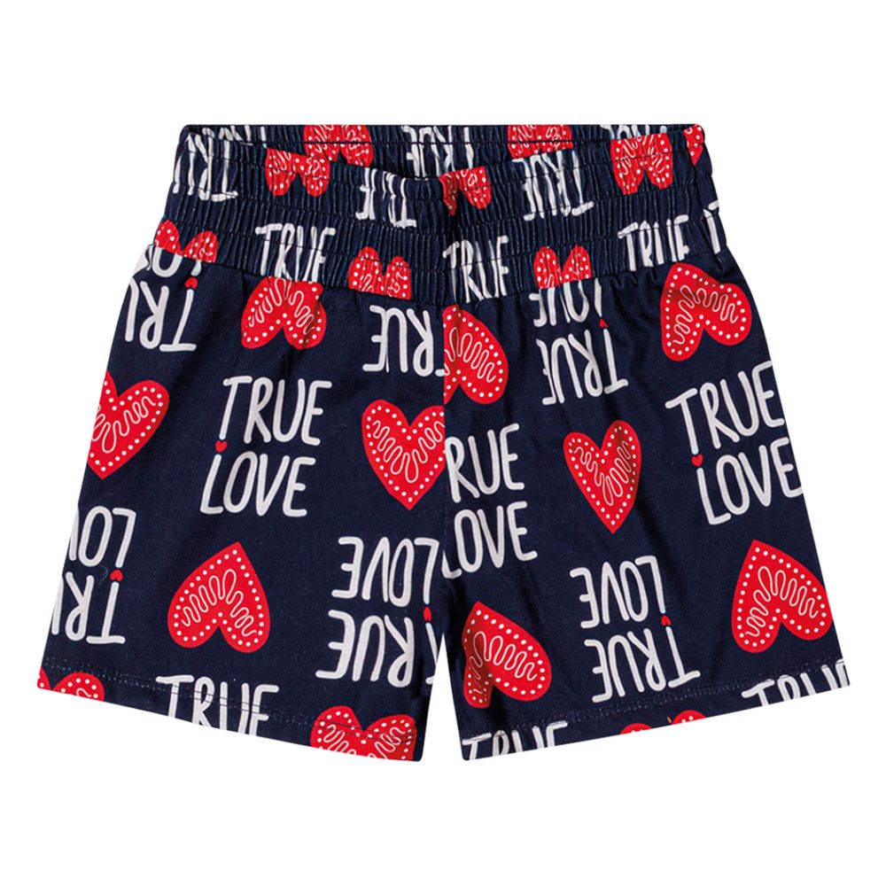 A estampa rotativa com corações e frases deixa o visual moderno e divertido, combinando facilmente com camisetas lisas ou blusas estampadas. É uma peça prática e estilosa para compor looks leves de forma fácil.