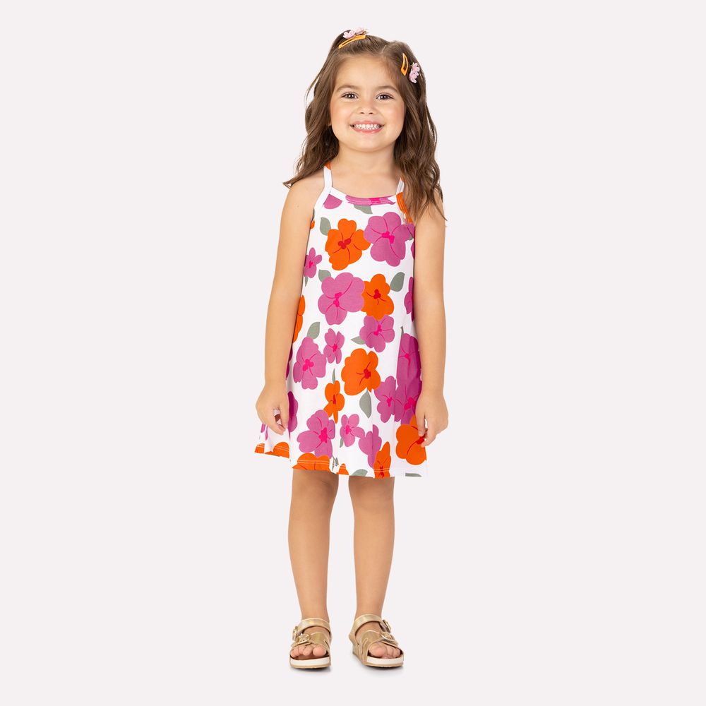 Um verdadeiro jardim em forma de vestido! O vestido infantil menina Kyly é confeccionado em meia malha 100% algodão, garantindo um toque suave, respirável e muito confortável para acompanhar a pequena em todas as suas aventuras com leveza.