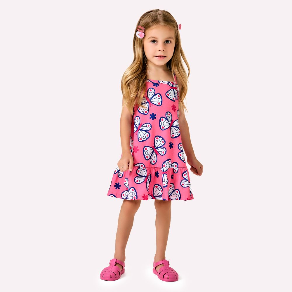 Seu decote com alcinhas finas e acabamento reforçado transmite leveza e frescor, ideal para os dias mais quentes. O charme extra fica por conta do babado franzido na barra, que acrescenta volume e um toque divertido ao visual. A peça é totalmente coberta por uma estampa rotativa de borboletas, que encanta à primeira vista e transforma qualquer ocasião em um momento especial. Ideal para combinações com tênis, sandálias ou jaquetinhas nos dias mais frescos, o vestido Kyly transforma qualquer ocasião em um momento especial com muito estilo e conforto.