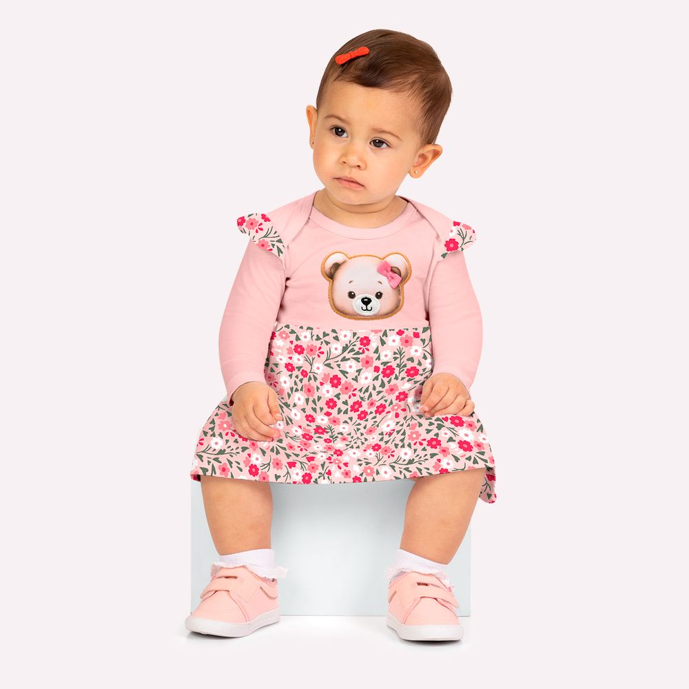 A parte superior apresenta um adorável bordado de ursinho com laço, trazendo um toque lúdico e sofisticado ao visual. As mangas longas com babados em estampa delicada de flores adicionam movimento e feminilidade à peça. Já a saia com estampa inspirada na natureza cria um efeito fluido e encantador, enriquecendo o design com leveza e harmonia. O acabamento é cuidadosamente pensado para proporcionar conforto e um caimento impecável. Um vestido bebê menina perfeito para ocasiões especiais, passeios em família e momentos inesquecíveis, unindo beleza, praticidade e um toque de ternura.